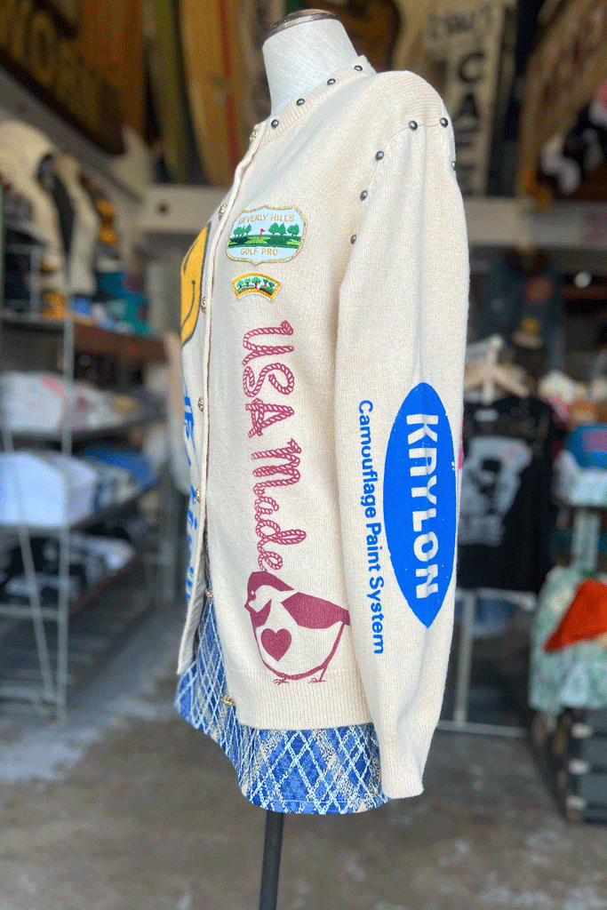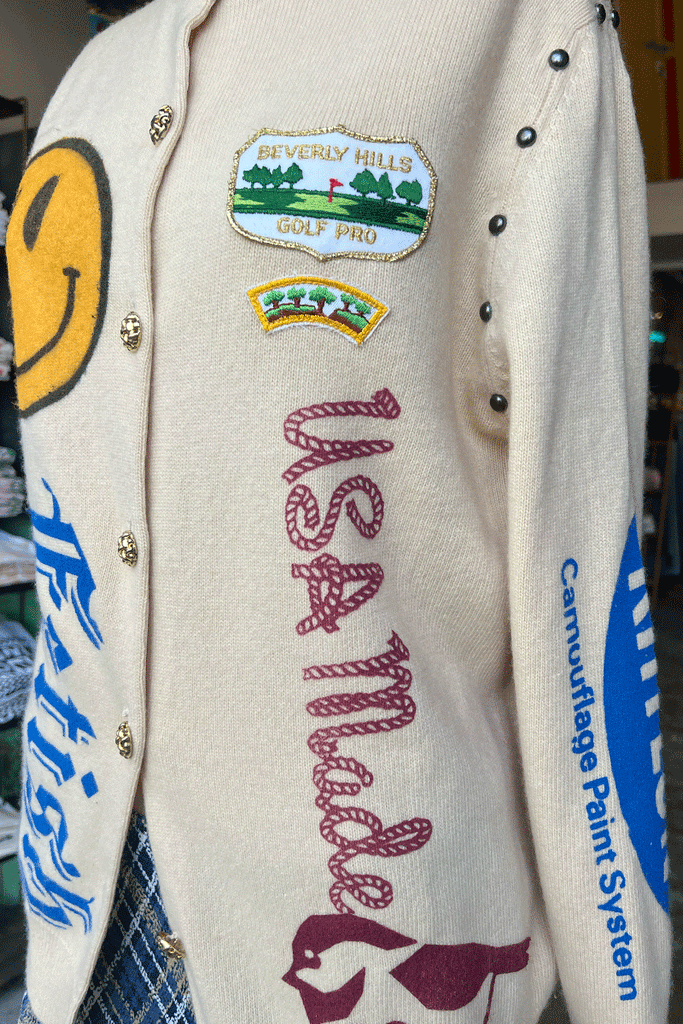 This Ivory cardigan is the vintage cashmere of your dreams! All of our one-of-one cashmere sweaters feature the coolest vintage and modern silkscreened graphics. 100% of the embellishments are meticulously hand done by us with our Loveworn® hands.