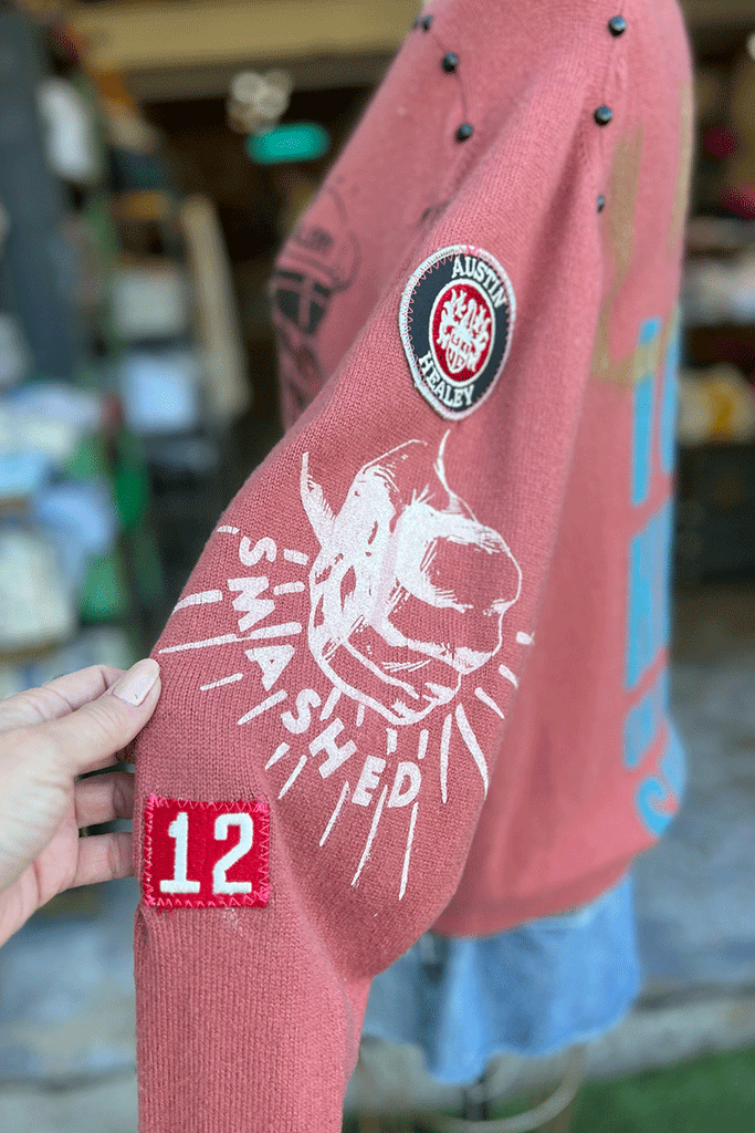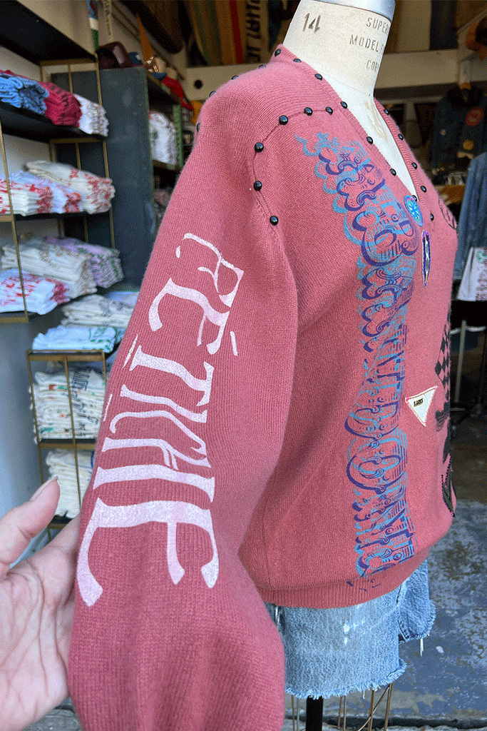 "I get high on my own supply" All of our one-of-one cashmere sweaters feature the coolest vintage and modern silkscreened graphics. 100% of the embellishments are meticulously hand done by us with our Loveworn® hands.