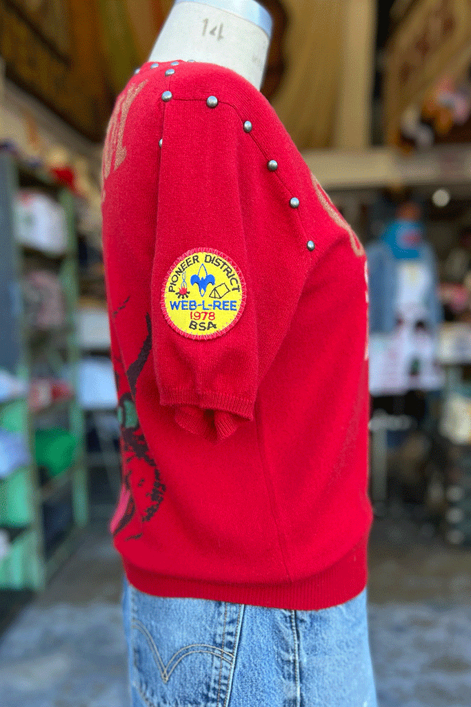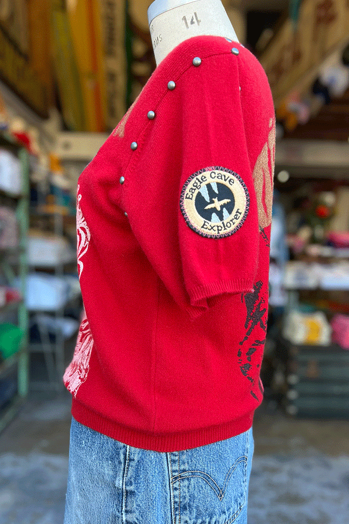 Perrrrrfectly red vintage cashmere featuring Zoozoo ! All of our one-of-one cashmere sweaters feature the vintage and modern silkscreened graphics. 100% of the embellishments are meticulously done by us with our Loveworn® hands.