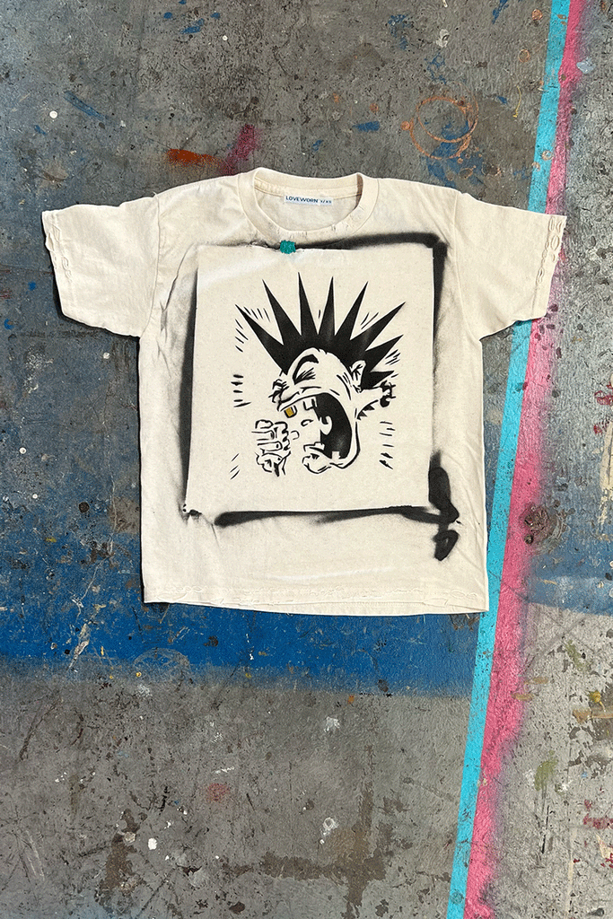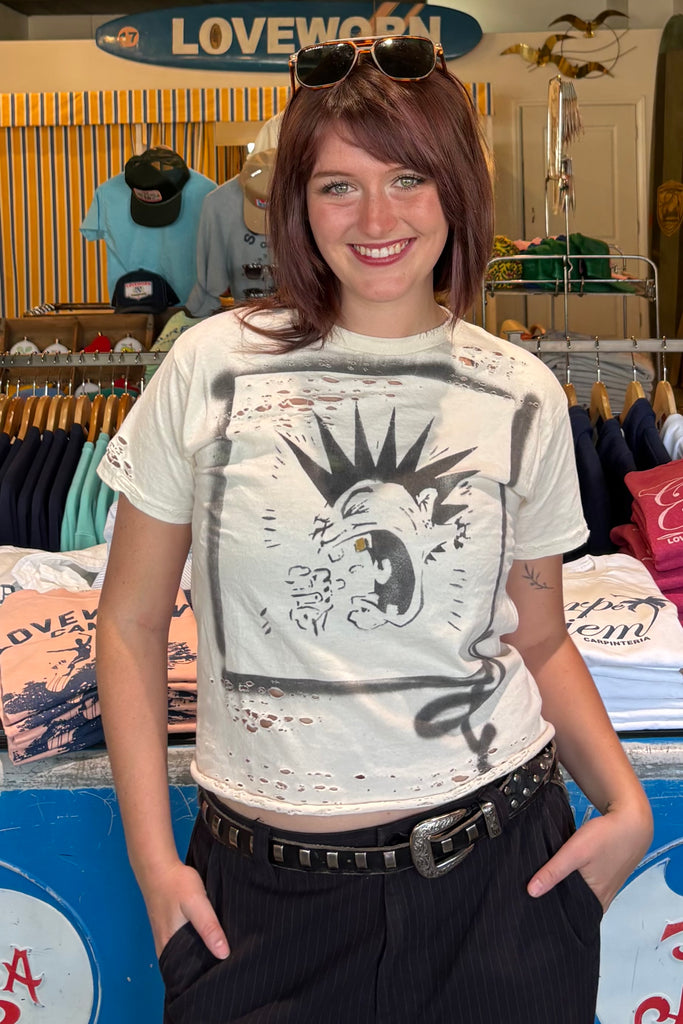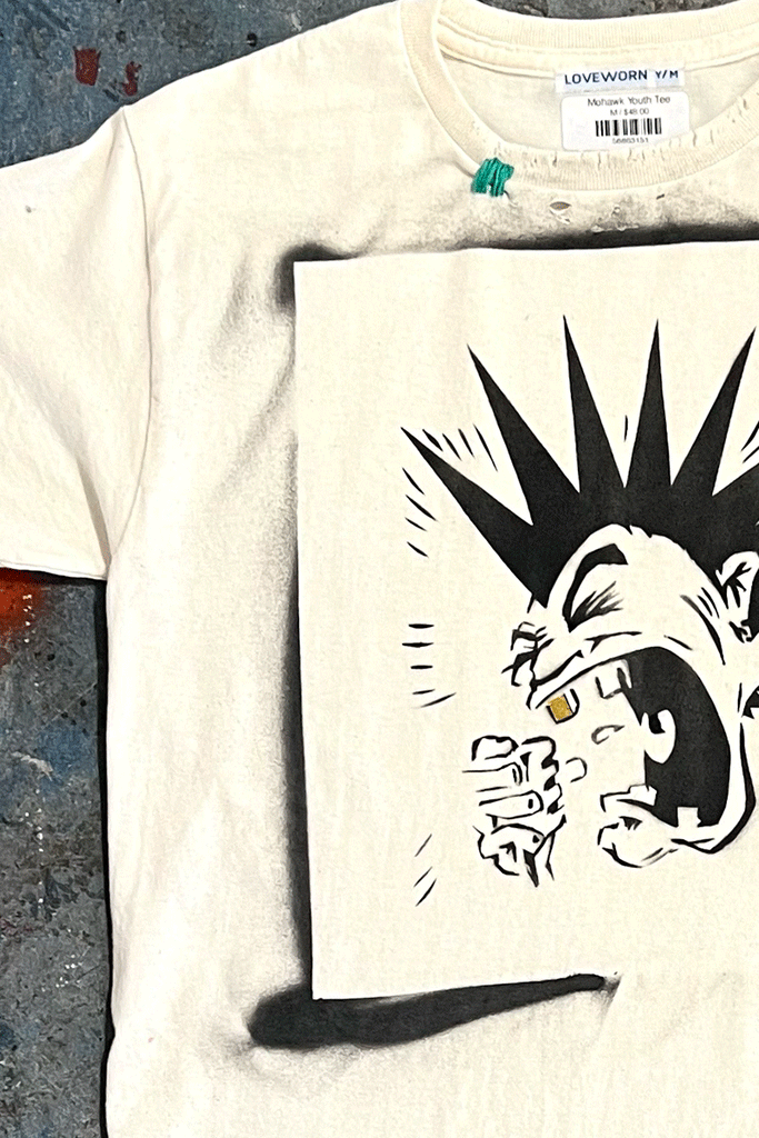 Hit the mosh pit in our new Mohawk youth tee. The kiddos love our t-shirts but they're also popular with the adults that like the "shrunken" vintage tee shirt look. Our punk rock tee is hand-stenciled, here at our Santa Barbara Funk Zone studios. Details include hand distressing, hand-painted good tooth and hand-embroidery, making no two exactly alike.