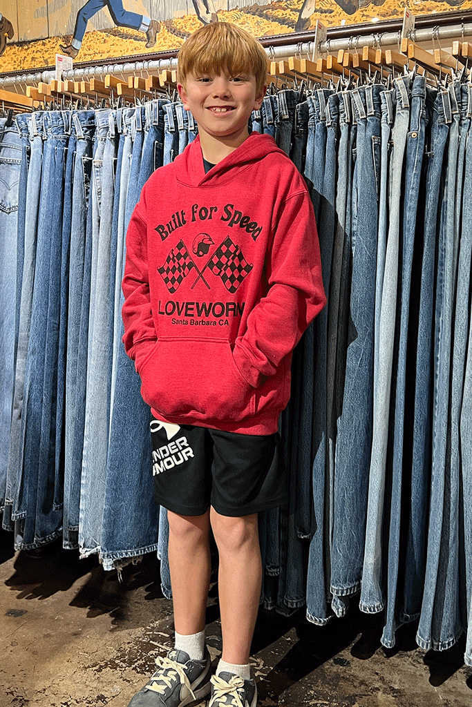 Retro fun sweatshirt in the softest fleece. Designed by us and hand-screened right here in Santa Barbara. Heather Red with black "Built for Speed" graphics.