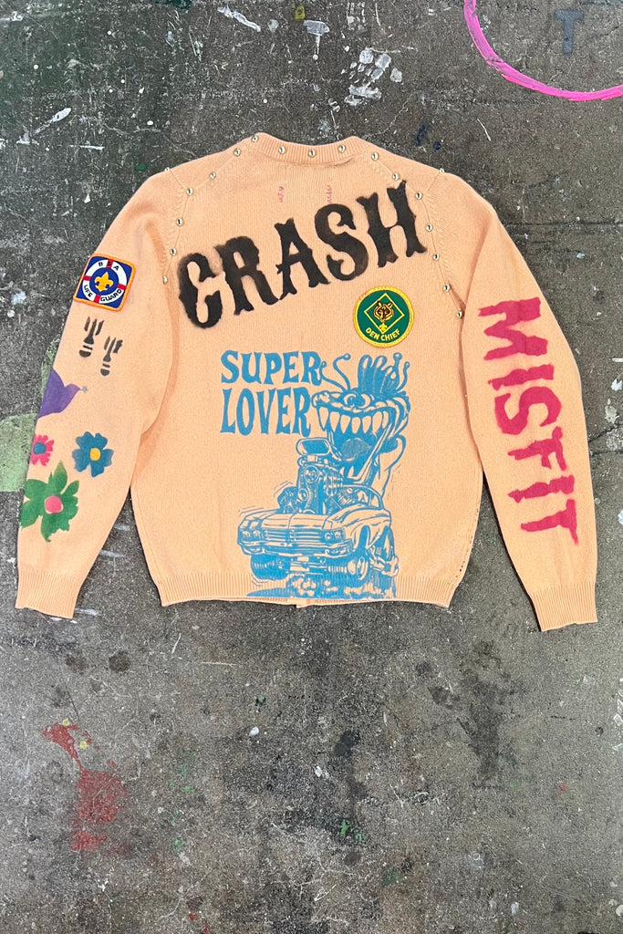 The peachy keen vintage cashmere of your dreams! All of our one-of-one cashmere sweaters feature the coolest vintage and modern silkscreened graphics. 100% of the embellishments are meticulously hand done by us with our Loveworn® hands.