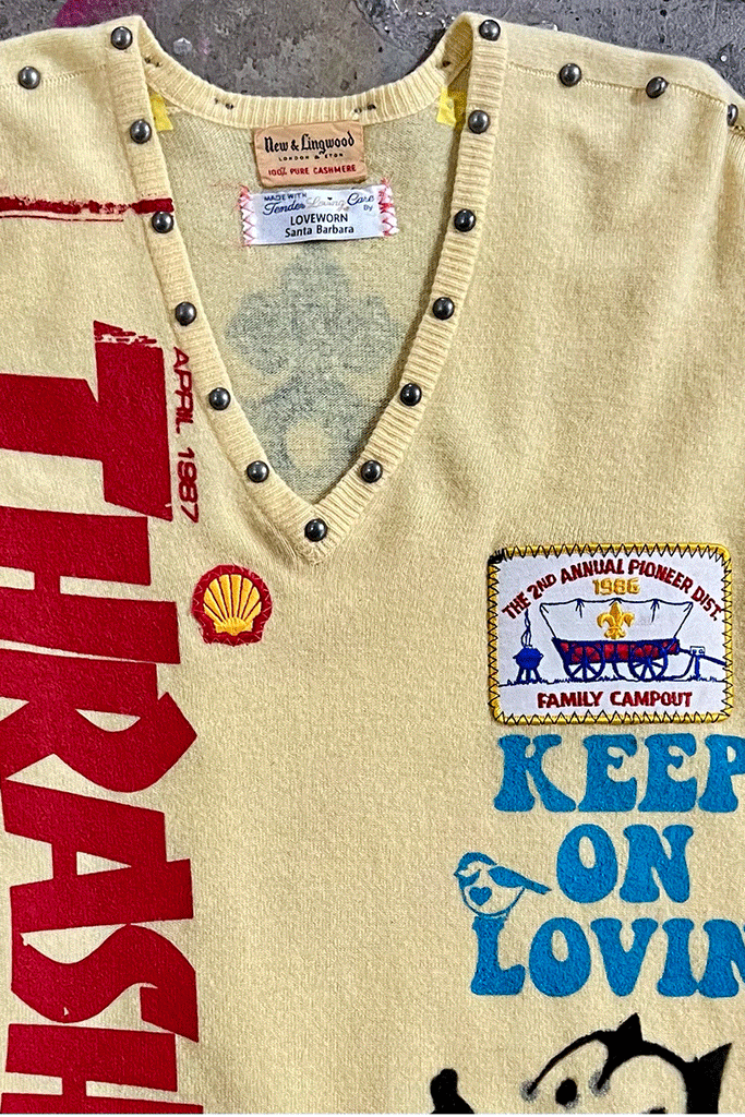 The chicest canary yellow vintage cashmere of your dreams! All of our one-of-one cashmere sweaters feature the coolest vintage and modern silkscreened graphics. 100% of the embellishments are meticulously hand done by us with our Loveworn® hands.