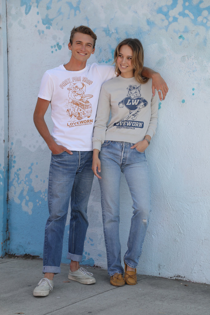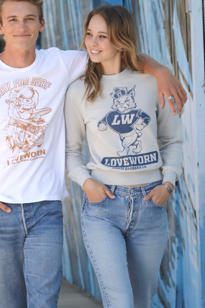 Meet Duke. We love this grumpy cat. This sweatshirt features original Loveworn art, hand screened onto the softest, French terry. Shorter in length, classic retro styling. Light grey body with faded navy print.
