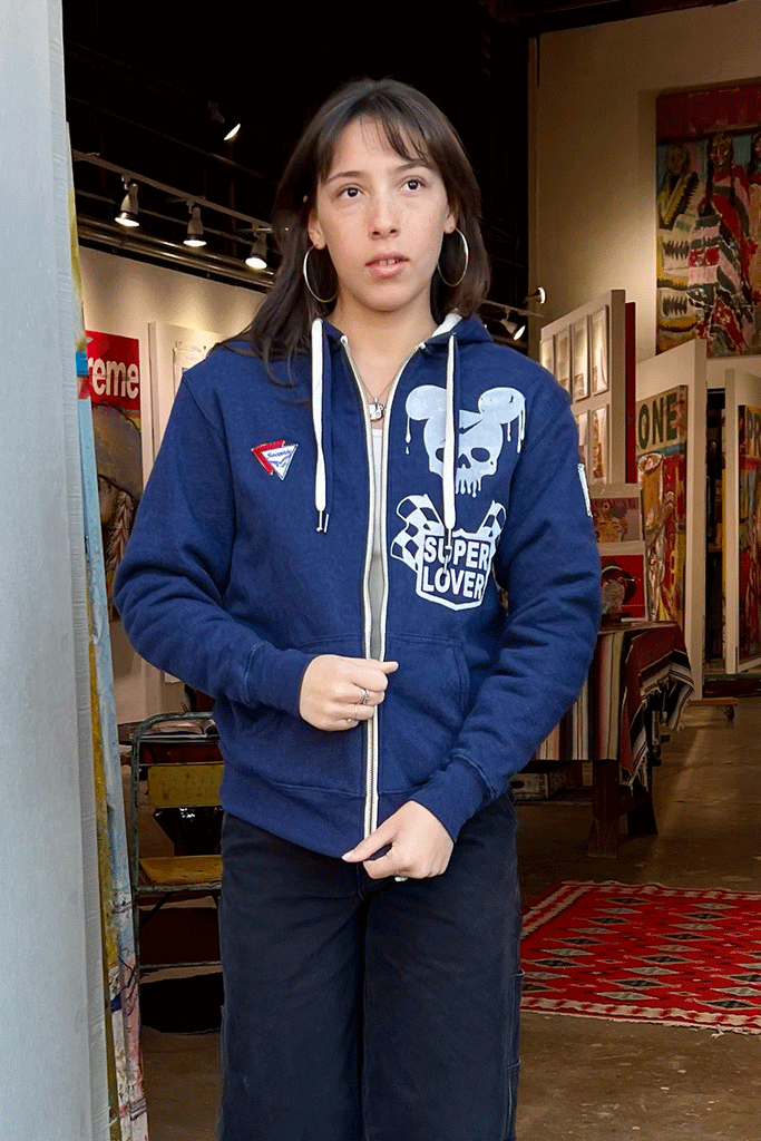 Cozy meets rebellious in this artisan-crafted Super Lover hoodie. Soft fleece lining keeps you warm while hand-screened graphics and embroidery add unique character. Features two vintage deadstock patches and convenient thumb holes for extra comfort. Perfect for beach days, city streets, or wherever your style takes you.